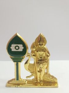 Decorative idol of Lord Murugan, a prominent Hindu deity, accompanied by his divine spear, the Vel, and his mount, the peacock.