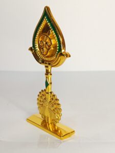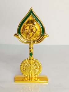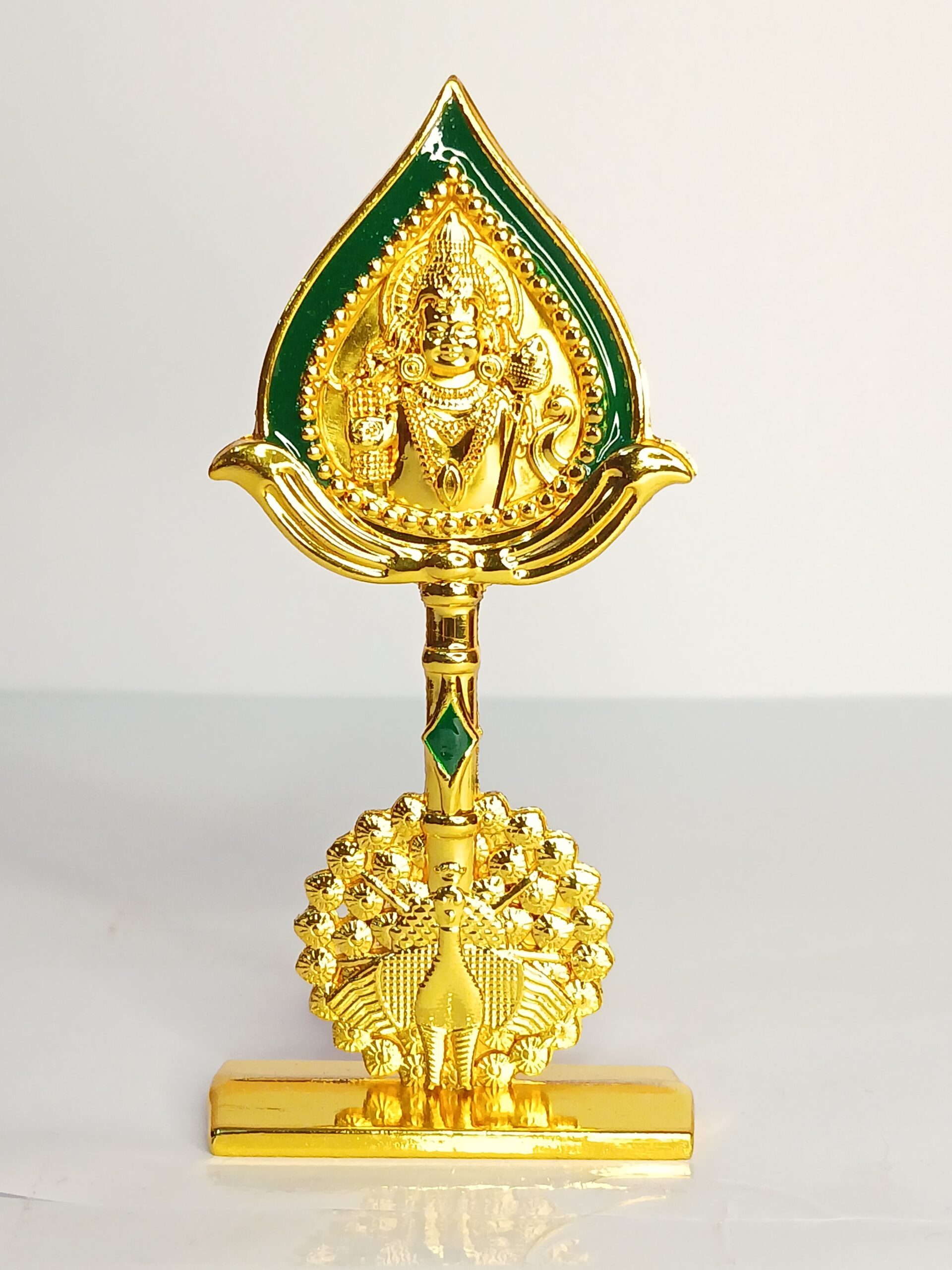 - Design: This idol typically features a depiction of Lord Murugan’s face or the sacred “Om” symbol on the Vel, mounted on a base, often in the shape of a peacock, as seen in the image.